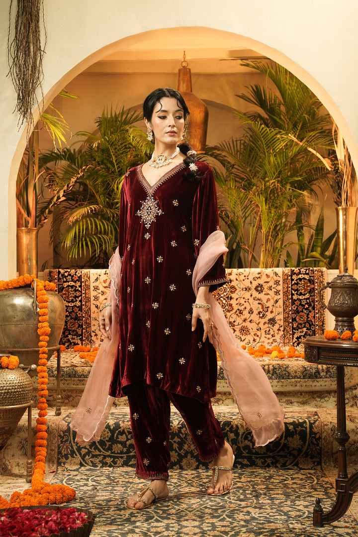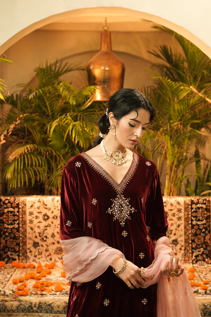 Maroon noor velvet kurta set, designed to make every moment feel regal. The kurta features a soft V-neckline highlighted with intricate gold-toned embellishments, complemented by scattered butti embroidery that enhances the richness of the velvet. Paired with matching embroidered velvet pants and a delicate blush-pink organza dupatta adorned with subtle motifs, this ensemble blends opulence with effortless charm. Perfect for weddings, celebrations, and refined evening gatherings.