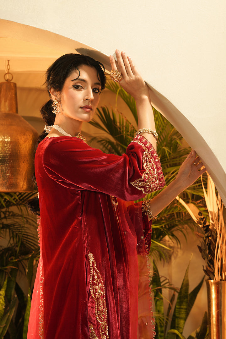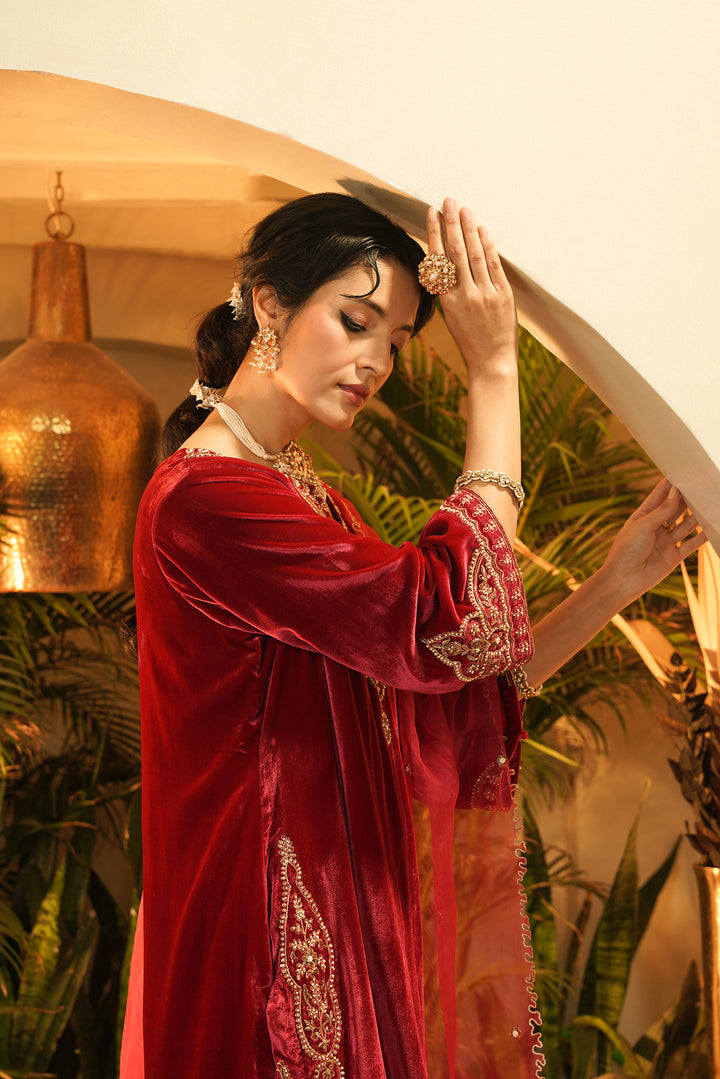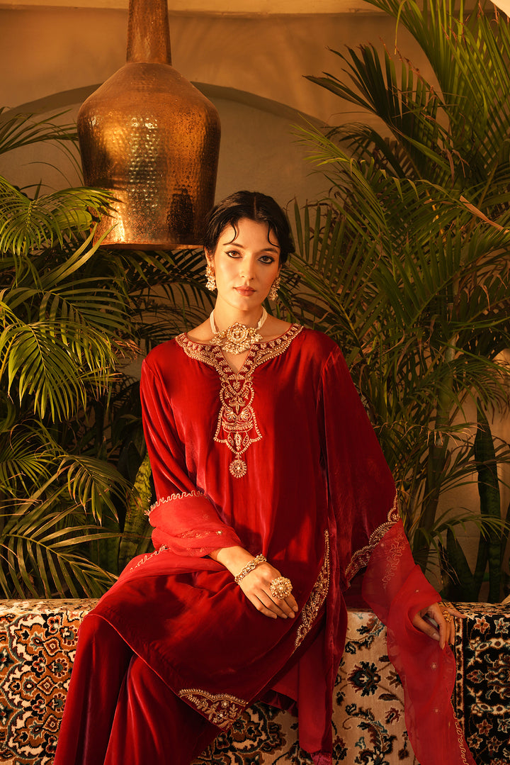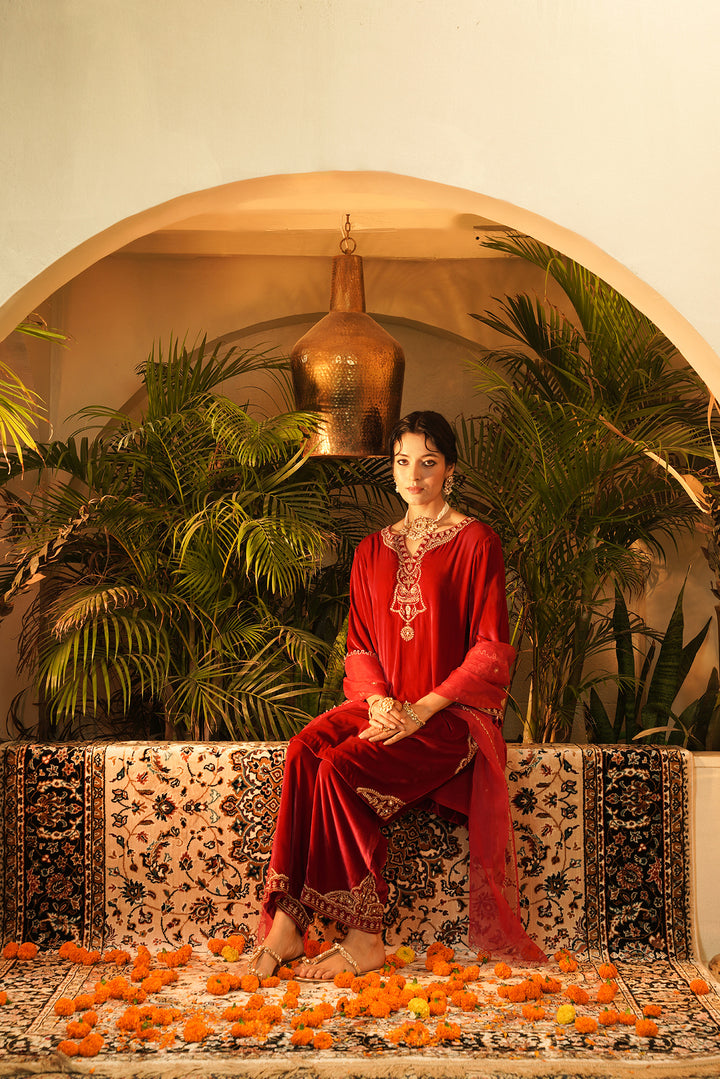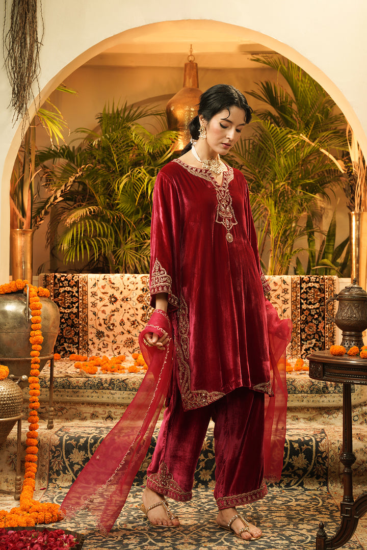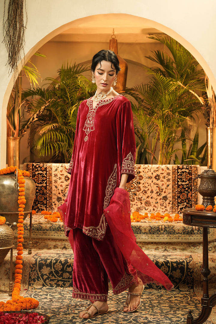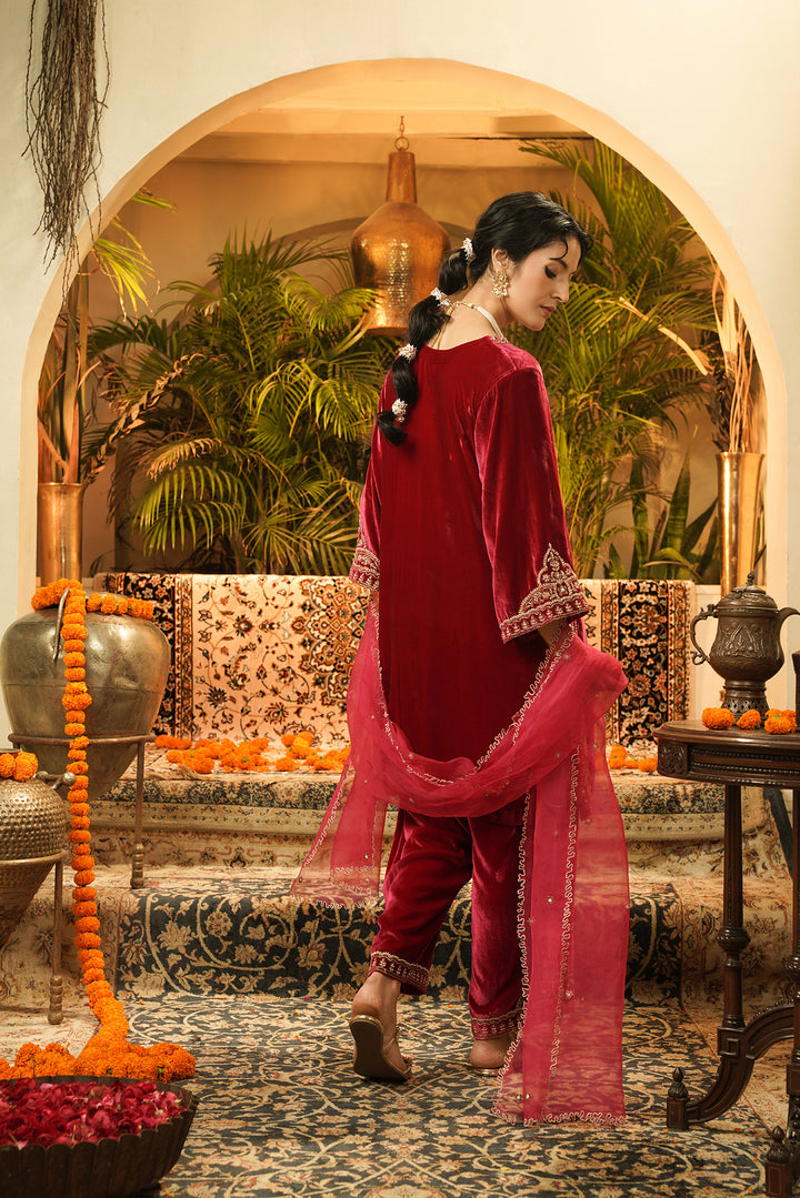A regal velvet kurta set adorned with intricate hand-embroidered detailing along the neckline, sleeves, and hem. The rich velvet kurta features a gracefully flared silhouette, complemented by matching velvet pants embellished with coordinated embroidery. Paired with a soft organza dupatta scattered with delicate motifs, this ensemble exudes timeless festive elegance—perfect for weddings, celebrations, and evening occasions.