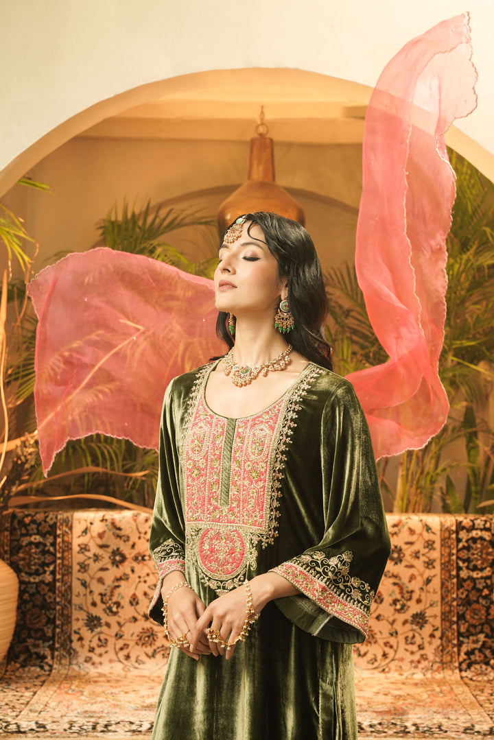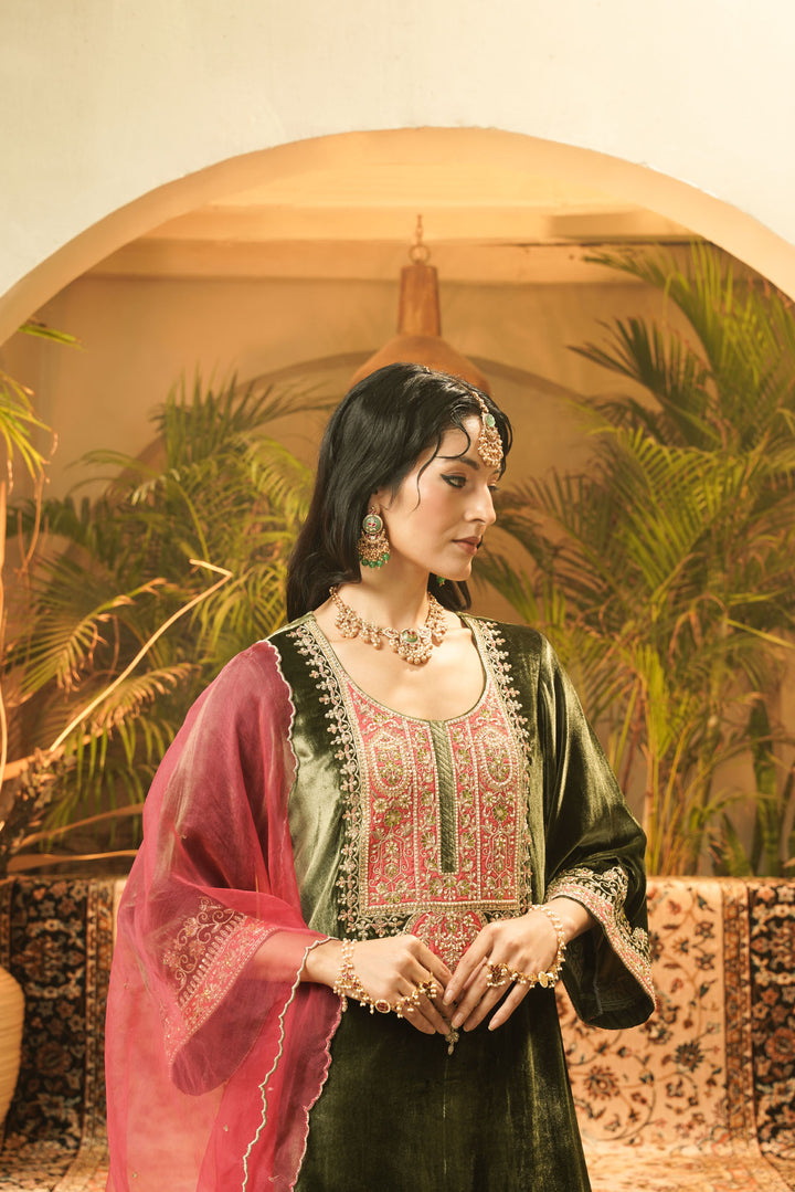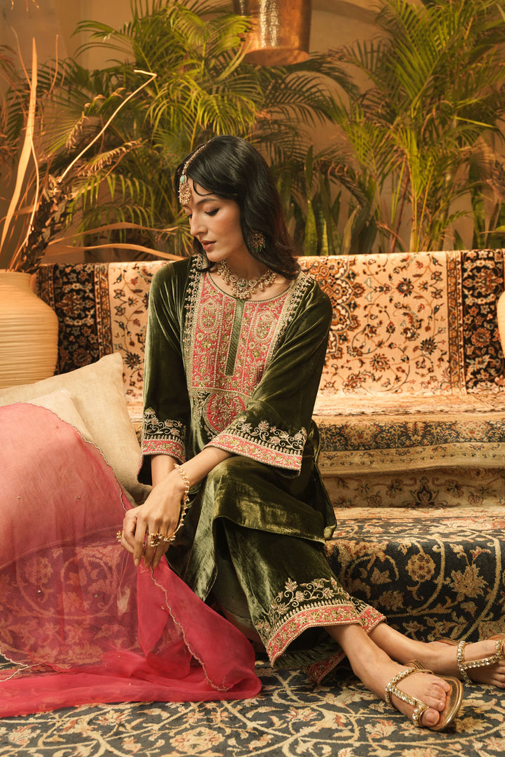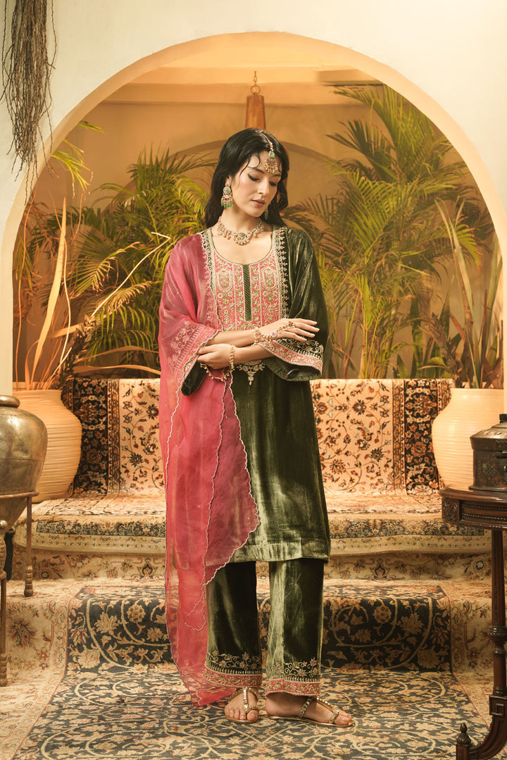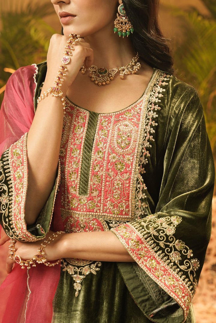 This elegant olive-green velvet kurta set features rich zari and thread embroidery in gold and pink, highlighted by an intricately designed front panel and matching borders on the sleeves and hem. Paired with a contrasting pink dupatta and coordinating trousers, this outfit blends luxurious fabric with traditional craftsmanship, making it perfect for festive occasions, weddings, and winter celebrations.