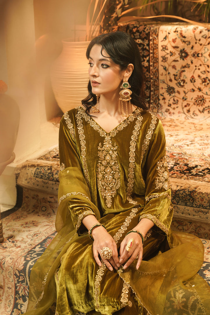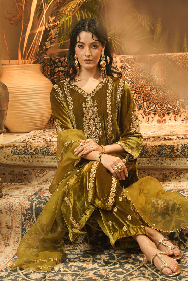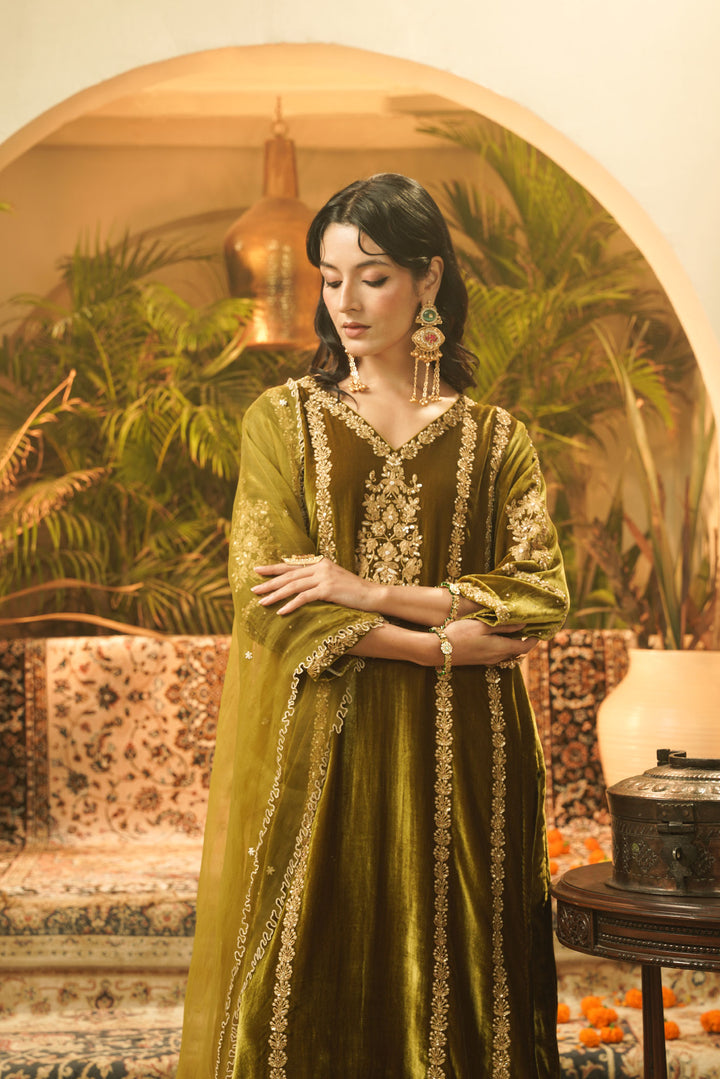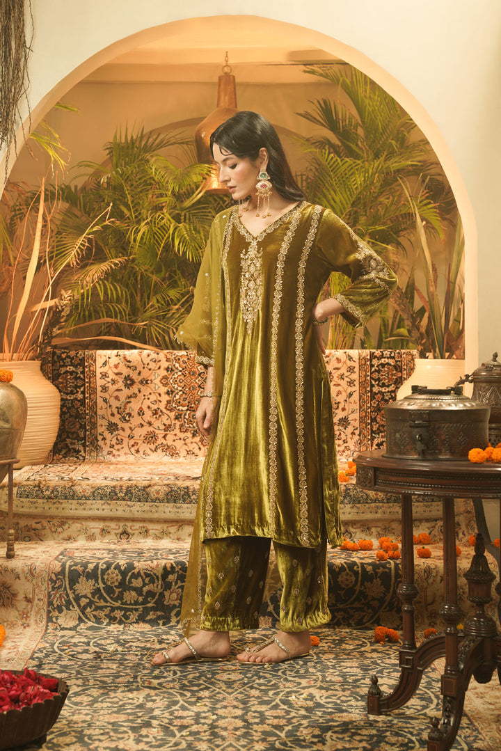 An elegant olive-toned velvet kurta set crafted for a rich festive and occasion-wear look. The kurta is adorned with detailed gold thread embroidery running along the neckline, panels, and sleeves, creating a beautifully structured silhouette with a royal finish. The soft velvet fabric catches the light with every movement, enhancing its luxurious appeal. Paired with matching embroidered pants and layered with a lightweight sheer dupatta, this ensemble offers a perfect blend of traditional artistry and modern grace. Ideal for festive gatherings, evening celebrations, and wedding functions.