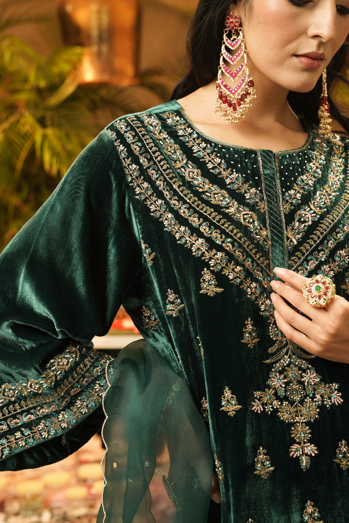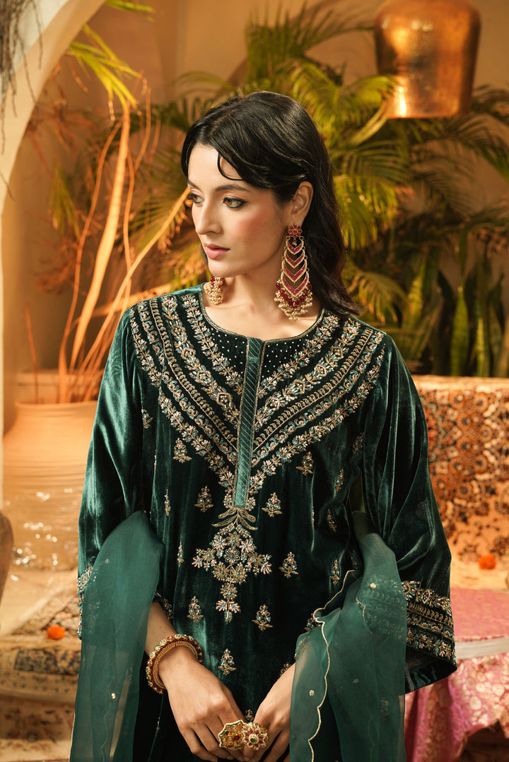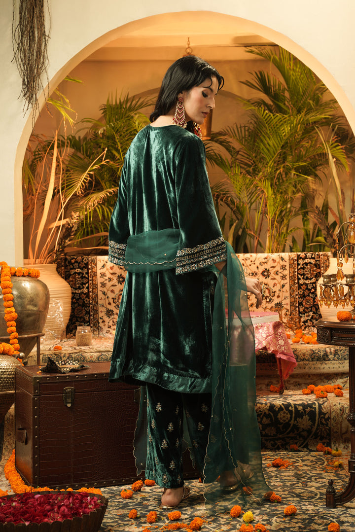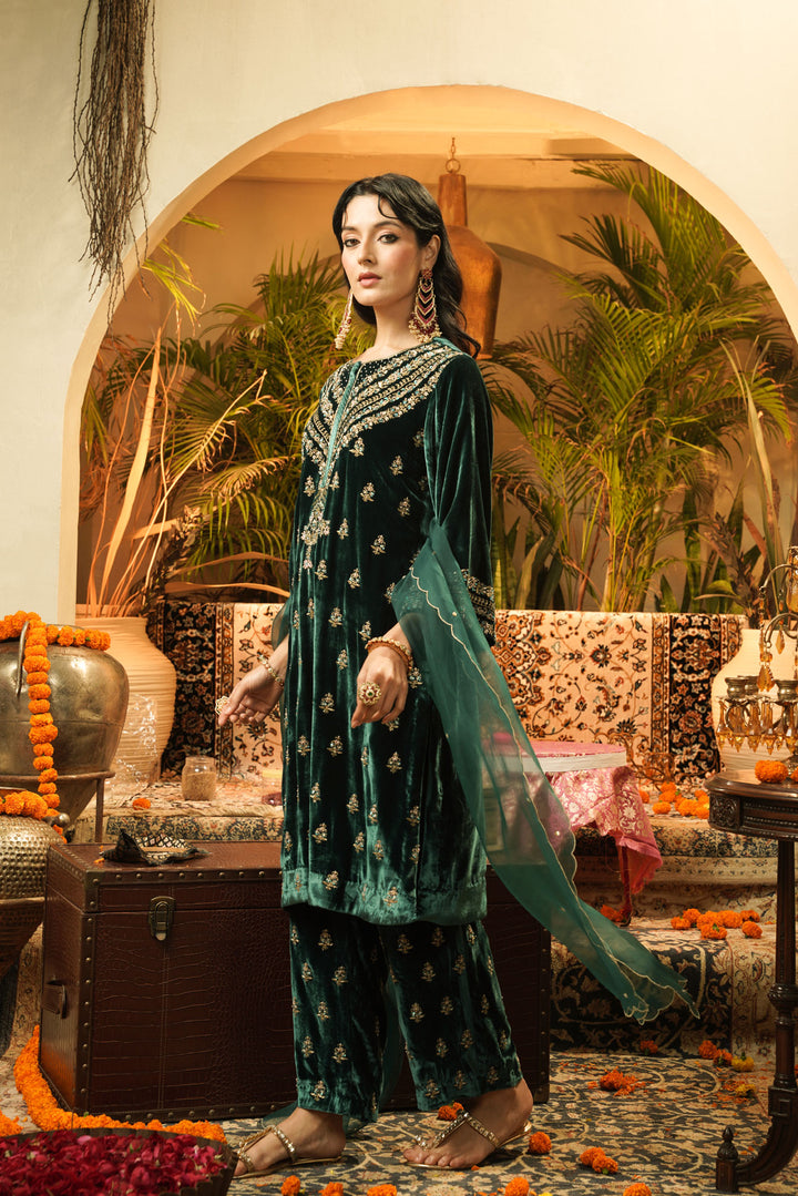 An opulent teal velvet kurta set, exquisitely crafted with intricate zardozi embroidery and fine hand embellishment across the neckline, bodice, and sleeves. The sharply detailed yoke design adds depth and dimension, while delicate motifs scattered all over enhance its regal appeal. Paired with matching velvet pants for a seamless look and finished with a soft organza dupatta with scalloped zari edging and hand detailing, this ensemble is designed for grand festive evenings, weddings, and special celebrations where elegance is everything.